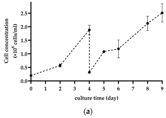 The viable cell density of the harvested cells was determined using the method outlined in Section 2.9, and the necessary volume of the cell suspension was then transferred to a previously prepared spinner culture, as described in Section 2.3, to achieve an initial cell density of 200,000 cells/mL. Subsequent cell growth was monitored throughout the cell culture (Figure 1b).