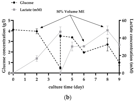 Figure 7a,b illustrates the cell growth, glucose, and lactate concentration in the optimized condition following in situ cell detachment in the bioreactor, as outlined in Section 2.7. The initial four days of culture were conducted in the first bioreactor, seeded with cells that were harvested from the flask. The subsequent 5 days of culture were followed by in situ cell detachment. The CPPs were in the design space determined by hybrid models: MC concentration of 3.6 g/L, seeding density of 16.86 cells/bead, and agitation speed of 90–100 rpm. After in situ cell detachment, the cell concentration reached 2.5 × 106 cells/mL, which is in perfect agreement with the predictions of the model for these process conditions. In this culture, as described in the method, two rounds of medium exchange (ME) were conducted on the 2nd and 4th days of culture with fresh medium containing 10% FBS. However, the second medium exchange can be performed with a medium containing no FBS without any impact on the cell growth trend (Supplementary materials, Figure S5).
