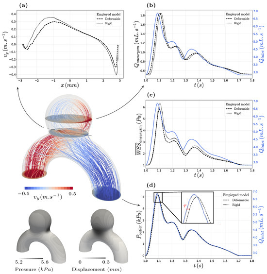 Detailed flow analysis of the proposed FSI case R. Systolic flow lines and pressure and surface displacement contours are displayed on the left side of the panel. They are complemented by four graphs, which detail the observed haemodynamics and compare them with the equivalent rigid configuration. The parent vessel’s inflow rate is overlaid on all three graphs on the right for visualizing time shifts over the cardiac cycle. (a) First, the velocity vertical component is plotted along the grey line traversing the neck as a reference curve. (b) On the right, the upward-going flow rate traversing the aneurysm bulge at its centre’s altitude ( mm) is displayed. (c) Below, we report the surface-averaged WSS over the aneurysm bulge (defined by mm). (d) Lastly, we depict the pressure variations at the system’s outlet.