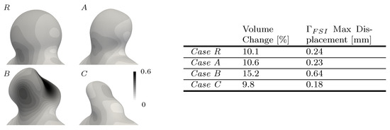 As for the pressure, Figure 5d reveals a time delay of ms between the inflow rate peak and the maximum outflow pressure. The tissue compliance allowed for delayed and damped flow variations between the inlet and outlet, which directly affected the prescribed boundary conditions (1). In terms of spatial distribution, pressure values continuously decreased along the vessel’s centreline with concentration spots on the outer curve of the inflow vessel and in the impingement area at the neck. This pressure field dominantly dictated the wall’s expansion movement over shear forces, resulting in almost no tilting of the aneurysm in response to the inflow jet at the neck, agreeing with previous observations [15]. The recorded volume variation and displacements (see Figure 6) lay in the range of previously reported values [20,23].