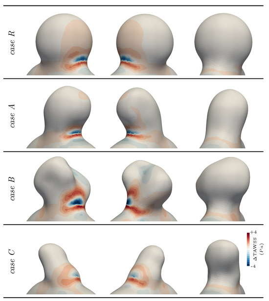 Although inspired by a real aneurysm shape, case A did not deviate significantly from the reference case, even when looking at the details. Cases B and C, per contra, had very different flow mechanisms, leading to large deviations between rigid and compliant tissue modelling. First, case B featured a weak structural spot, which consequently deformed under internal pressure due to its negative curvature, as displayed in Figure 6. The induced change in geometry reoriented the inflow jet and locally reduced by more than 15% of the TAWSS values at the aneurysm distal wall. As indicated by the dotted annotations in Figure 9, the initially split aneurysmal flow (rigid configuration) was merged in one general swirl for the compliant configuration due to the outward bulging of the solid membrane. As a result, the dome’s exposure to the flow increased, as illustrated by the consequent drop in the OSI in that area displayed in Figure 8, which revealed the alteration of the almost stagnating flow that was observed there in the rigid case. In this patch, TAWSS also increased fivefold when moving from rigid to compliant wall modelling, stressing the major change in the local flow pattern.