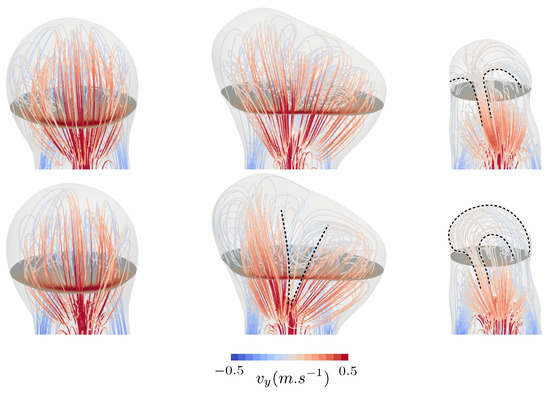 Systolic flowlines for the three specific bulge shapes. Velocity streamlines are shown for cases A, B and C to illustrate the shape of the flow inside the aneurysm bulge using compliant wall modelling (top row) compared with a fully rigid treatment (bottom row).