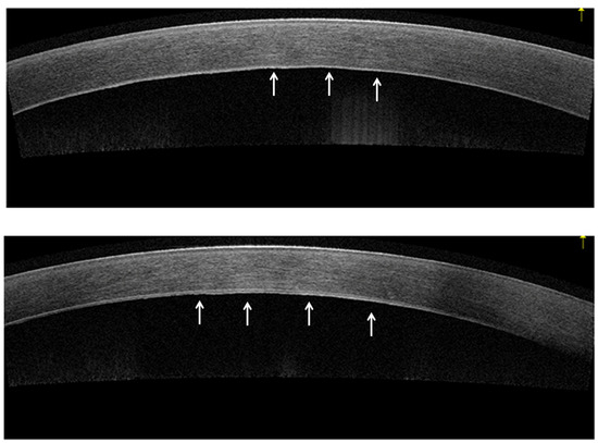 Cross-sectional AS-OCT images of FECD. AS-OCT displays the wavy and irregular appearance of the corneal Descemet Membrane (white arrow).