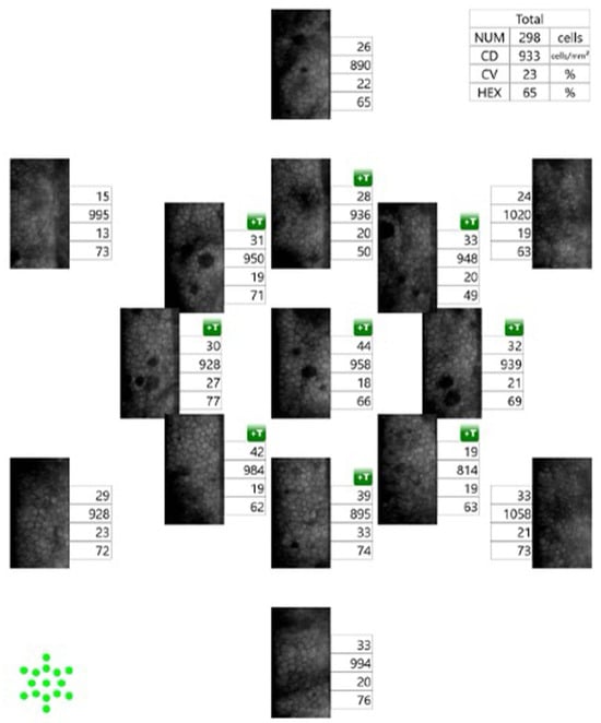 Representative image of non-contact wide-field specular microscopy (CEM-530, Nidek Co., Ltd., Gamagori, Japan) of an FECD patient. Each scan captures one central, eight paracentral (1.3 mm away from the center), and six peripheral (7.3 mm away from the center) images.