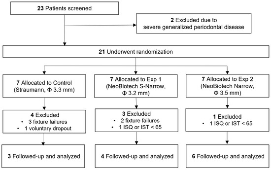 The required sample size was calculated using the analysis of variance (fixed effects, omnibus, one-way) of parallel design using G*power 3.1.9.2 (University of Düsseldorf, Düsseldorf, Germany). The calculation was based on a previous randomized controlled clinical study by Al-Nawas et al. [18] on small-diameter bone-level implants. The random allocation ratio of the groups was 1:1:1 (control group–experimental group 1–experimental group 2). The estimated survival rates were 0.988, 0.99, and 0.975 for the control, experimental group 1, and experimental group 2, respectively. The standard deviation was set as 0.01. The alpha error probability was 0.05, and the statistical power was 0.80. The required number of implants in each group was nine; therefore, the required number of participants in each group was five. Considering the expected total dropout rates of 20%, 10% by patients and 10% from clinical study procedures, seven subjects were required in each group. Therefore, 21 patients were included in this study.