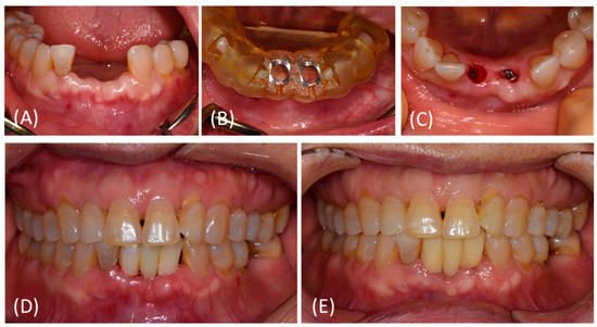 Representative photos of treatment procedures. (A–C) Implant placement at #32, 41 site using a surgical template without flap opening. The surgical template was removed after initial drilling. (D) Immediate provisionalization was performed on the day of surgery. (E) At 12 weeks after surgery, no pathologic sign was detected. Customized titanium abutments and zirconia bridge (screw- and cement-retained prosthesis) were delivered.
