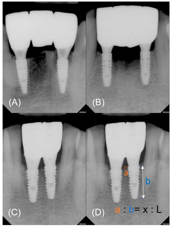 Representative periapical radiographs of each group. (A) Control. (B) Experimental group 1. (C) Experimental group 2. (D) The actual value of marginal bone loss (x) was calculated by converting the measured value (a) using the amplification ratio. The amplification ratio was obtained from the known length of a fixture (L) and measured length (b).