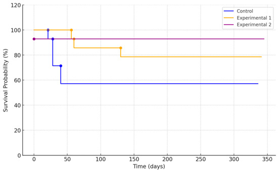 For the patients who diligently completed all prescribed clinical protocols, the implant success rate was 100%. Throughout the one-year observation period, the percentages of patients lost due to failure to meet the requisite criteria were 50.0%, 42.9%, and 14.3% in the control, experimental group 1, and experimental group 2, respectively. Regarding implant survival rates, the percentage of implants in situ at the conclusion of the one-year clinical study period were 66.7%, 85.7%, and 100% in the control, experimental group 1, and experimental group 2, respectively. Regarding implant survival rates, the total number of followed-up implants were 12, 14, and 14 for the control, experimental group 1, and experimental group 2, respectively. The number of surviving implants, or the fixtures that were not removed after surgery, were 8, 12, and 14 for the control, experimental group 1, and experimental group 2, respectively. Among the “failed implants” described in Table 3, those with low stability values were not removed unless they showed pathological signs. Therefore, the percentages of implants in situ at the conclusion of the one-year clinical study period were 66.7%, 85.7%, and 100% in the control, experimental group 1, and experimental group 2, respectively. The Kaplan–Meier survival analysis curve is shown in Figure 4. When performing the log-rank test, no statistically significant difference was observed in survival time among the three groups (p = 0.999).