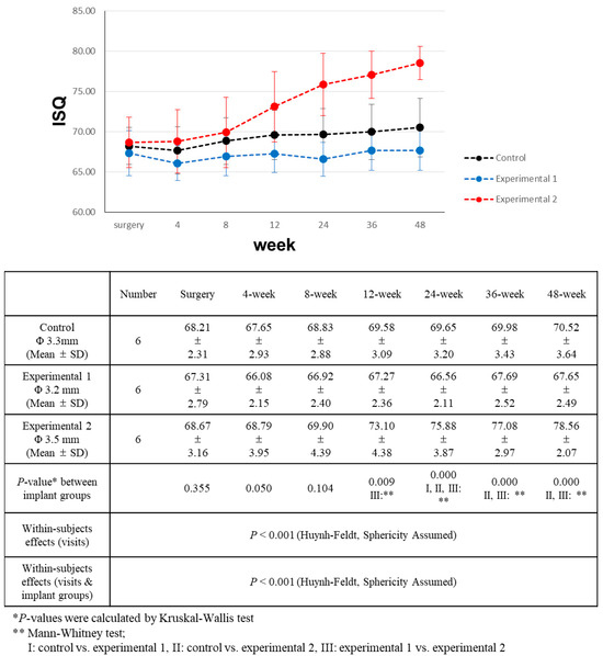 Comparison of implant stability quotient (ISQ) value changes over a 48-week period.