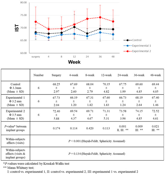 Comparison of implant stability test (IST) value changes over a 48-week period.