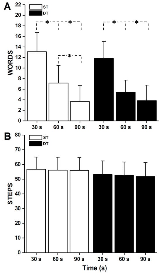 Changes in WORDS (A) and STEPS (B) every 30 s for both single- and dual-tasks. Significance, indicated with *, is only shown for statistical differences between the single-task and dual-task.