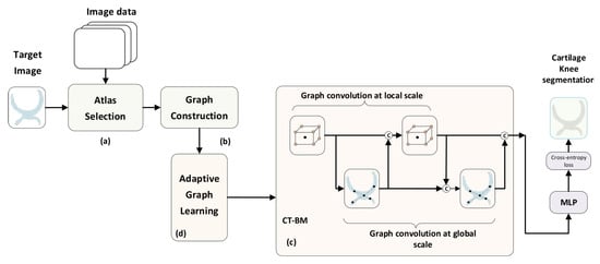 Outline of the proposed knee cartilage segmentation approach. It comprises the atlas subset selection (a), the graph construction part (b), a specific form of graph-based convolutional model (c), the adaptive graph learning (d), and the MLP network providing the class estimates for the segmentation of the target image. Black dots correspond to central nodes and colored nodes to neighboring ones, respectively. The encircled C symbol represents an aggregation function.
