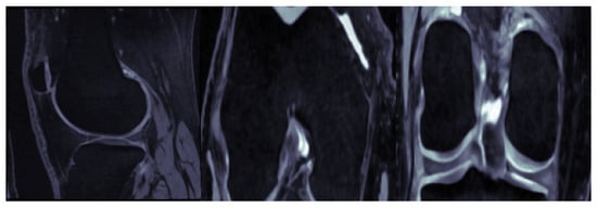 A typical knee MRI viewed in three orthogonal planes (left to right: sagittal, coronal, axial).