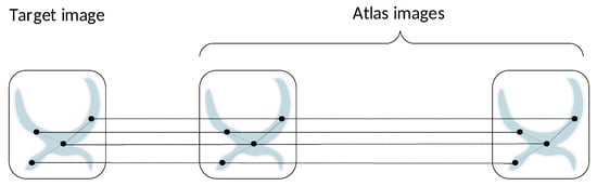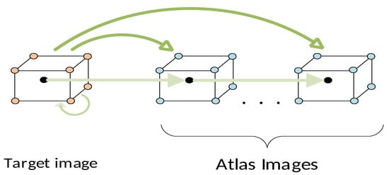Multi-atlas patch-based methods have long been a staple in medical imaging applications [,]. Utilizing an atlas library comprising magnetic resonance images and their corresponding label maps , these methods operate on a single target image at a time, annotating it by propagating voxel labels from the atlas library . The implicit assumption in this framework is that the target image and the corresponding images comprising the atlas library reside in a common coordinate space. This assumption is enforced by registering all atlases along with their corresponding labels maps to the target image space, via an affine or deformable transformation [].