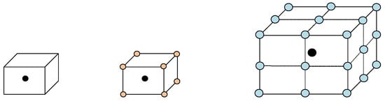 A generic patch (left) representing a node . The corresponding 1-hop (, middle) and 2-hop neighborhoods (, right), corresponding to and hypercubes, respectively. Black dots correspond to root nodes, while colored ones stand for the neighboring nodes. All nodes are represented by patches.