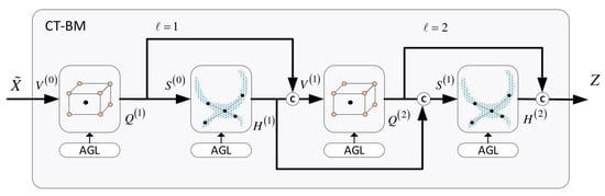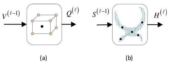 Recently, intensive research has been conducted in the field of graph convolutional networks, owing to their efficiency in handling non-Euclidean data []. These models can be distinguished into two general categories, namely, the spectral-based [,] and the spatial-based methods [,,,,]. The spectral-based networks rely on the graph signal processing principles, utilizing filters to define the node convolutions. The ChebNet in [] approximates the convolutional filters by Chebyshev polynomials of the diagonal matrix of eigenvalues while the GCN model in [] performs a first-order approximation of ChebNet.