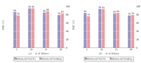 Table 3 presents extensive comparative results, contrasting our DMA-GCN models with traditional patch-based approaches, and state-of-the-art deep learning architectures established in the field of medical image segmentation. We also applied six graph-based convolution networks in the comparisons. These networks were used as standalone models solely to conduct global learning of the nodes. Finally, we applied the more integrated MGCCN model []. For the DMA-GCN models, we applied the following parameter setting: atlases, attention heads, spatial scales, dense layers, and transductive learning with a mini-batch size of 128.