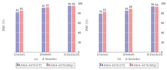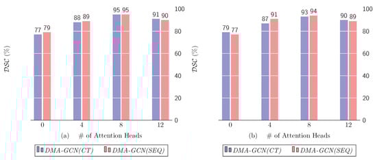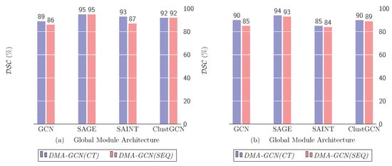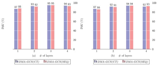 Figure 15a clearly demonstrates an upwards trend in the obtained rates as the number of dense layers increases. The lowest performance is unsurprisingly achieved for the shallow network of a single layer (CT-BM). The best results are achieved for , while the inclusion of an additional layer diminishes slightly the accuracy, an effect most likely attributed to overfitting. A similar pattern of improvements can also be observed for the case of DMA-GCN(SEQ) model. Concluding, the proposed densely connected block architectures lead to deeper GCN networks with multiple local–global convolutional layers, which can acquire more comprehensive node features, and thus offer better results.