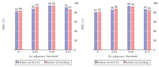 As can be seen, large sparsity values considerably reduce the segmentation accuracy, which suggests that preserving only the strongest graph edges decreases the aggregation range from neighboring nodes, and hence the expressive power of the resulting models. On the other hand, similar deficiencies are incurred for low sparsity values with dense matrices . In that case, the neighborhood’s range is unduly expanded, thus allowing aggregations between nodes with weak spectral similarity. A moderate sparsity of the adjacency matrices corresponding to a threshold value of attains the best results for both DMA-GCN(CT) and DMA-GCN(SEQ).