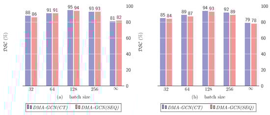 Both figures share a similar pattern of results. Noticeably, in the mini-batch learning, the best results were achieved for a batch size of 128. This value referred to the size of the initial batch as well as the out-of-sample batches extracted from the target . Given these batches, we then proceeded to the formation of the sequences of aligned nodes and the sequence libraries at multiple scales, to generate the corresponding graphs of nodes used for convolutional learning. Finally, the full-batch learning provided a significantly inferior performance compared to the mini-batch scenario.