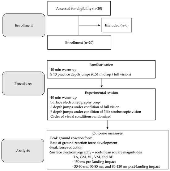 Experimental data were collected during the second visit. Participants first completed the same 10 min warm-up performed during familiarization. During a 10 min rest period, EMG electrodes (Mini Wave Infinity, Cometa, Milan, Italy) were placed over the tibialis anterior (TA), medial gastrocnemius (GM), vastus lateralis (VL), vastus medialis (VM), and biceps femoris (BF) of the leading drop leg. Electrodes were located and attached in accordance with standard recommendations from the SENIAM project (Surface EMG for Non-Invasive Assessment of Muscles; seniam.org). Participants then completed the investigation protocol, consisting of 6 successful DJ trials performed under conditions of full vision (control) and 3 Hz stroboscopic vision (experimental). The order of the conditions was randomized, with all trials performed in each condition before advancing to the second condition. DJ trials were performed using procedures consistent with familiarization. All trials were monitored visually by a member of the research team. Successful trial criteria included landing with both feet simultaneously and performing a maximal jump upwards upon landing with minimal delay (e.g., ground contact time). For each trial, time-series GRF (1000 Hz) and EMG (2000 Hz) signals were time-synched and captured using Vicon Nexus software (Version 2.12, Vicon Motion Systems Ltd., Oxford, UK).