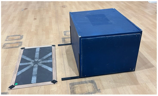 During the first visit, participants first underwent a familiarization of the investigation protocol. Familiarization involved the completion of a 10 min warm-up consisting of stationary cycling for 5 min followed by a standard jumping warm-up as per the National Strength and Conditioning Association (NSCA) [23]. Participants then rested for 3 min while a member of the research team provided a visual demonstration of the DJ technique. Following the demonstration, participants performed a minimum of ten practice DJs with full vision. Practice trials were monitored by a member of the research team, with augmented verbal and visual feedback provided when necessary. The DJ technique involved participants self-initiating a drop from a 0.51 m platform [24,25] to land on a tri-axial force platform (Model FP4080, Bertec Corporation, Columbus, OH, USA) that was recessed to be flush with the laboratory floor and positioned 0.30 m in front of the dropping platform (Figure 2). For each practice trial, participants self-initiated the drop after receiving the following standard verbal cue: “Step forward from the platform with your preferred foot. Land from the drop with both feet impacting the ground simultaneously and perform a maximal jump upwards as quickly and as high as possible” [24,25]. Participants were also instructed to focus their visual gaze on a marker placed 0.30 m in front of the force platform during the drop. Participant arm motion was not restricted, facilitating a jumping technique that more accurately represents the performance of jumping and landing in real-world settings.