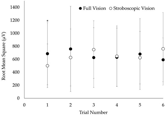 Visual condition × trial number interaction on vastus medialis medium-latency response. Electromyography data were collected from a sample of 20 young adults performing 0.51 m depth jumps under conditions of full and stroboscopic vision. Error bars represent ± 1 standard deviation. * Significantly different from full vision (p < 0.05).