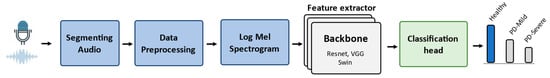 29]. Similarly, Shah et al. employed a CNN-based model that analyzed 1 s speech chunks transformed into log-scaled mel spectrograms (LMS) for detecting PD from vowel phonations of /a/ and /i/, achieving 90.32% accuracy [