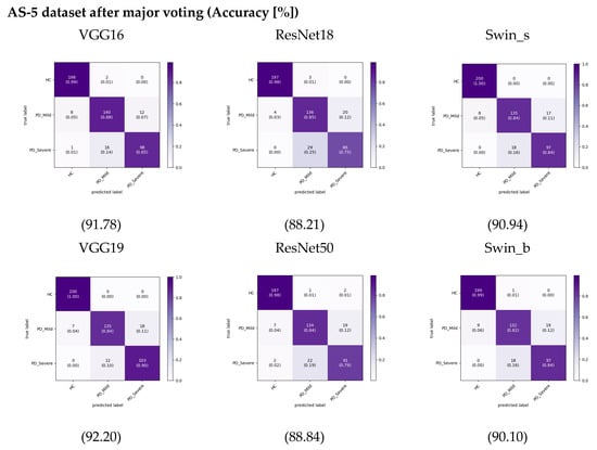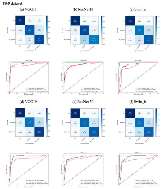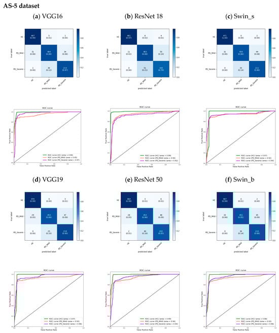 Figure 9), demonstrating strong identification of healthy subjects. For PD classes, VGG16 achieved slightly higher AUCs compared to other models. Furthermore, the analysis revealed an increase in the AUC from the FS to the AS dataset, particularly for the PD_Mild class, with a 4% improvement. This suggests that the models exhibited slightly better discrimination capabilities when utilizing the full-segment dataset. Furthermore, the transformer-based models exhibited higher AUC values when trained on the larger AS-5 dataset, suggesting that these models benefited from the increased data availability for improved classification performance.