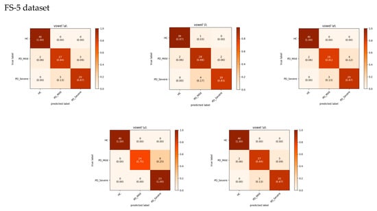 Figure 9 suggests that the models excel at accurately identifying samples from the HC group, exhibiting the highest precision and recall for this class. For the FS-5 dataset, there were no instances where an HC sample was incorrectly predicted as PD_Severe or vice versa. However, some instances labeled PD_Severe were misclassified as PD_Mild, and vice versa, indicating potential challenges in distinguishing between these two classes. To better evaluate the VGG16 model’s accuracy for different vowels, we grouped the results by the sustained vowel present in the dataset. The confusion matrices for each vowel are shown in