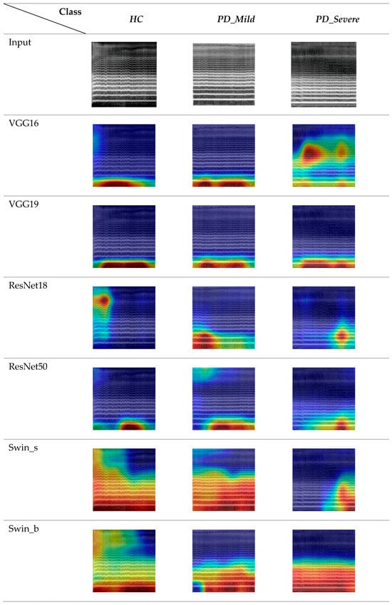 When examining the temporal patterns for the healthy class, it was evident that CNN models primarily focused on the first half to the middle of the audio clips, while transformer-based models were more consistent across time frames. For the mild class, models generally concentrated on the middle period. For the severe class, VGG16 displayed a distinct pattern compared to the other studied models. This model was activated on the middle frequency range (around 2048 Hz) and the timeframes of the initial segments. Additionally, there was a moderately intense region towards the end of the spectrogram. In contrast, the other models focused more on the second half of the audio clips and lower frequencies.