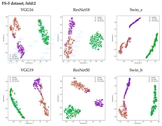 The t-SNE visualization clearly shows three distinct clusters corresponding to the Healthy, PD_Mild, and PD_Severe classes across all models. Architectures like VGG16, Swin_s, and ResNet50 exhibit cleaner separations between these class clusters, suggesting their ability to extract more discriminative features from the log mel spectrogram images. Notably, the ResNet50 model forms the most compact clusters, indicating higher feature similarity within each class. However, there is some overlap between the PD_Mild and PD_Severe classes, particularly in the region where their feature points intersect. This overlap suggests that certain mild and severe cases may share similar feature characteristics, making it challenging to distinguish them based solely on the extracted features.
