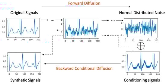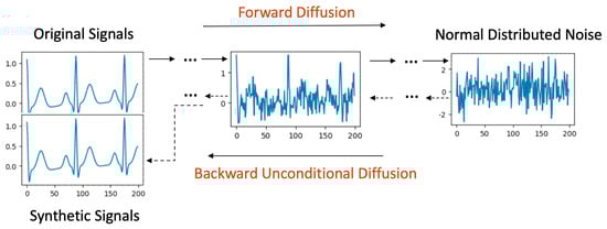 The remainder of this paper is structured as follows: Section 2 delves into pertinent works related to signal synthesis. Section 3 provides an overview of Diffusion Probabilistic Models. Section 4 details our methodologies, including the development of BioDiffusion models and the evaluation metrics employed. Section 5 describes our experimental setup, the datasets used, and conducts a comparative analysis highlighting BioDiffusion’s superior performance. Section 6 addresses the significance, advantages, limitations, and future directions of our work. Finally, Section 7 concludes the paper. The source code can be found via the following link: https://github.com/imics-lab/biodiffusion (accessed on 5 March 2024).