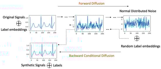Forward Process with Labels: In this process, as depicted in Figure 2, original signals are systematically associated with their corresponding labels. Within the U-Net architecture (detailed in Section 4.4), each residual block is enriched with both the scalar label and the ongoing diffusion timestep, leveraging an embedding technique.