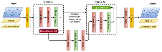 The U-Net model depicted in Figure 4 is an encoder–decoder-type convolutional neural network architecture specifically designed for effectiveness in signal processing tasks. We modify the model depicted in work [] to fit for time-series signals instead of N x N images. It features a symmetric structure with two primary pathways: the contraction path (encoder) and the expansion path (decoder). In Figure 4, the Down Sample block shows the encoder, and the Up Sample block shows the decoder.