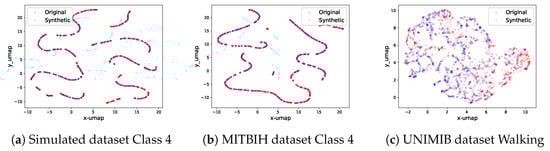 Real and synthetic signal UMAP projection on selected classes of MITBIH ECG dataset.