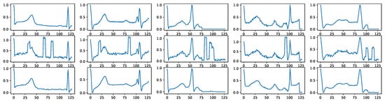 - The MIT-BIH Arrhythmia Dataset features 48 snippets of ambulatory ECG recordings spanning half an hour each from 47 subjects across five heart conditions [,]. The samples, originally recorded at 125 Hz, are adjusted to 144 in length for U-Net compatibility. The training set has 87,554 samples, with the majority class having 72,471 samples and the smallest class having 641. The test set includes 21,892 samples, ranging from 162 to 18118 samples per class, again underlining the dataset’s imbalance.