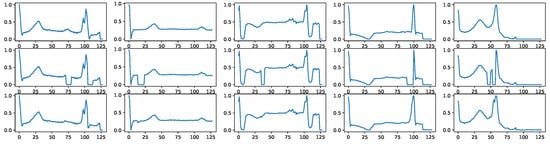 Signal imputation is another task that BioDiffusion can handle. Often, the collected signals may omit some missing values. We can use BioDiffusion to fill in those blanks. Figure A6 shows a few examples of signal imputation. The first row shows the original signals. The second row shows the same signals with some randomly missing values (values set to zero). We use them as signal conditions input to the diffusion model. The third row shows the reconstructed signals. We can see that the synthetic signals fill in the blanks and are very similar to the original signals.