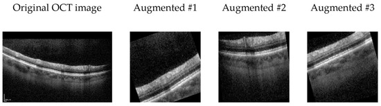 Exemplary OCT B-scan image alongside three augmented variants generated through random transformers.