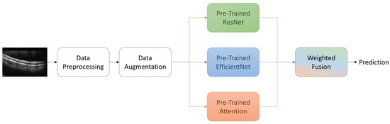 To achieve this, we employ a weighted fusion scheme to merge the probabilistic outputs of these diverse models. Unlike traditional fixed-weight ensemble methods, our approach utilizes trainable weights. During training, these weights dynamically adapt based on the performance of each model, allowing us to capitalize on their complementary insights effectively. The integration of ResNet, EfficientNet, and EfficientNet with attention mechanisms enables us to capture a wide range of features and patterns present in OCT images. ResNet’s deep residual learning capabilities, EfficientNet’s efficiency and scalability, and EfficientNet with attention’s focus on salient regions collectively contribute to the ensemble’s robustness.