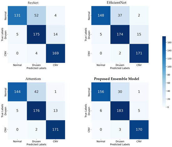 To provide a detailed assessment of the classification performance of each model, we present the four confusion matrices corresponding to ResNet, EfficientNet, Attention, and our proposed Ensemble Model. Each confusion matrix is a 3 × 3 table that displays the distribution of true labels versus predicted labels for the three AMD classes—Normal, Drusen, and CNV—across all datasets (see Figure 4).