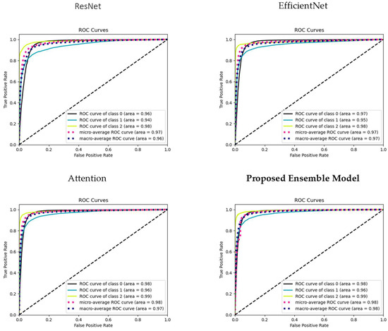 ROC curves illustrating model performance: individual class ROC curves (Classes 0, 1, 2), micro-average ROC curve, and macro-average ROC Curve. The dashed diagonal line represents a reference line (line of no-discrimination).