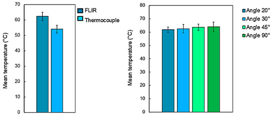 The results obtained by thermal imaging were then compared with the results obtained with a thermocouple K (USB TC-08, Pico Technology, Eaton Socon, UK) on the same samples. For each view angle, five acquisitions were undertaken by thermocouple on five different zones of the same sample. This approach allowed for the determination of a mean temperature for each sample at each angle of view. Figure 3 presents the mean temperature registered on the five different samples acquired by thermocouple measurements and thermal imaging at four different angles of view of the FLIR camera.