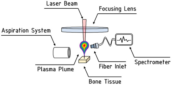 LIBS technique was used to analyze the evolution of the elemental composition of the bone tissue during laser processing [24,25]. A spectrometer Ocean Optics HR4000CG-UV-NIR (Ostfildern, Germany—acquisition range of 200 nm–1100 nm; optical resolution < 0.1 nm), was employed to record emission spectra of the plasma plume emitted from the irradiated bone tissue. Before the start of the laser processing, the acquisition fiber was aligned to maximize the emission spectra, and its real-time acquisition was recorded by the OceanView software. A scheme of the LIBS setup is shown in Figure 4.
