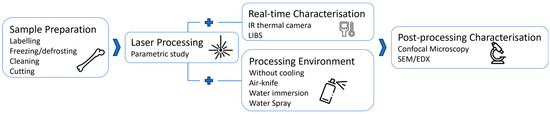 In this work, different methods were employed to monitor, analyze and finally control the heat dynamics of bone tissue upon industrial fs laser processing at two different irradiation wavelengths (1030 nm and 515 nm) and varying laser processing parameters. The thermal accumulation on the irradiated bone tissue was investigated by varying the spatial overlap between successive laser pulses. Different water-based and air-based processing environments were evaluated to observe the influence of a cooling system on the bone tissue temperature. The temperature of the bone tissue during laser processing was quantified by thermal imaging (FLIR camera) and thermocouples measurements. Finally, laser-induced breakdown spectroscopy (LIBS) was employed as a real-time diagnostic system with which to observe the variation of the bone tissue elemental composition during laser processing in relation to the temperature analyses [31,32]. Post-processing characterization methods were carried out by scanning electron microscopy (SEM) and energy dispersive X-ray (EDX) analysis to qualitatively observe laser-induced morphological changes and the degree of elemental modification induced in the bone tissue after laser processing. Results demonstrate the possibility of maintaining the temperature of the bone tissue within acceptable values during the whole laser process by using water-based cooling methods coupled with moderate spatial overlap between successive laser pulses, without strongly affecting the ablation rates.