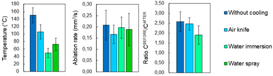 Figure 6. Evolution of (left-hand side) the mean temperature, (center) ablation rate and (right-hand side) ratio CBEFORE/CAFTER as a function of cooling environment. For each processing environment, 5 cavities were ablated with a wavelength of 515 nm at P = 6.27 W, RR = 250 kHz and scanning speed v = 2500 mm/s. Error bars represent data standard deviations.