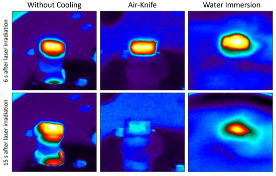 Figure 7. Images recorded from IR thermal camera 6 s and 15 s after the start of laser processing in three different processing environments (left: without cooling; center: air-knife; right: water immersion).