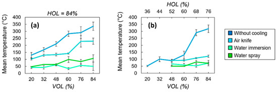 Figure 8. Evolution of the mean temperature as a function of the spatial overlaps VOL (a) and HOL (b) between successive laser pulses for the four different cooling methods. All cavities were ablated with a wavelength of 515 nm at P = 6.27 W and RR = 250 kHz. Error bars represent data standard deviations.