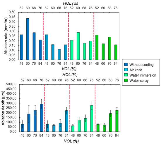 Regardless of the heat accumulation, it is also important to guarantee a sufficient ablation rate during laser processing in a specific cooling environment, as well as the possibility to precisely control the ablation depths. Figure 9 presents the evolution of the ablation rate and ablation depths with respect to a variation of laser-induced thermal accumulation, i.e., of HOL and VOL. As already observed in a previous study [20], there is a threshold value of cumulative energy absorbed by the bone tissue, beyond which the ablation rate eventually drops. The same behavior is observed here as shown in Figure 9: optimum values of HOL and VOL exist in the case of cooling with water immersion or no cooling. A less important effect of the accumulated absorbed energy on the ablation rate values is noticeable for the case of water cooling. For the lowest spatial overlaps between successive laser pulses (HOL, VOL < 60%), where the temperature of the bone tissue does not exceed the temperature for protein denaturation, the variations of ablation rate in different cooling environments are within a few percent only with respect to that found without any active cooling system. For a given amount of laser-induced thermal accumulation, the presence of a water-based cooling environment does not affect the ablation rate or the ablation depth in a considerable way with respect to a cooling system based on pressured air.