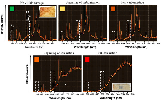 Figure 10. Evolution of the LIBS spectrum of bone tissue as a function of the laser-induced thermal state. Different states of the bone tissues are recognized are as follows: no visible damage (green, N = 4, HOL = 68%), beginning of carbonization (yellow, N = 4, HOL = 78%), full carbonization (light orange, N = 3, HOL = 81%), beginning of calcination (orange, N = 4, HOL = 81%) and full calcination (red, N = 4, HOL = 84%). All tests were carried at a wavelength of 1030 nm at P = 6.27 W, RR = 250 kHz and VOL = 84%. Dashed white rectangles highlight the three peaks (P1, P2, P3) which systematically change for different states of the bone tissue. Each section of the Y-axis corresponds to 200 intensity counts.